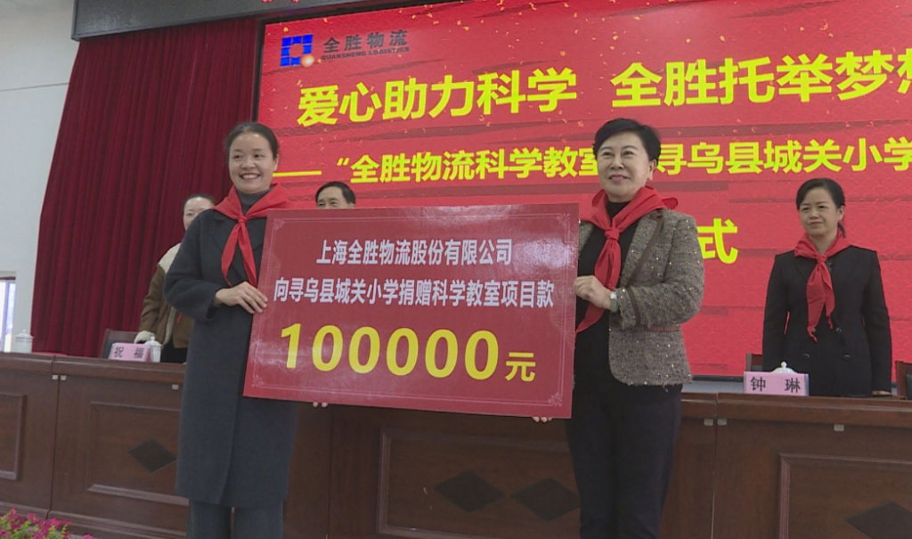 捐赠仪式现场,上海全胜物流股份有限公司为县城关小学捐赠了科学教室项目款十万元;为新建“全胜物流科学教室”揭牌;明亮的教室、齐全的设备,将为孩子们搭建起探索科学奥秘的崭新平台,也让这份跨越山海的爱心,在寻乌的教育沃土上落地生根、开花结果。